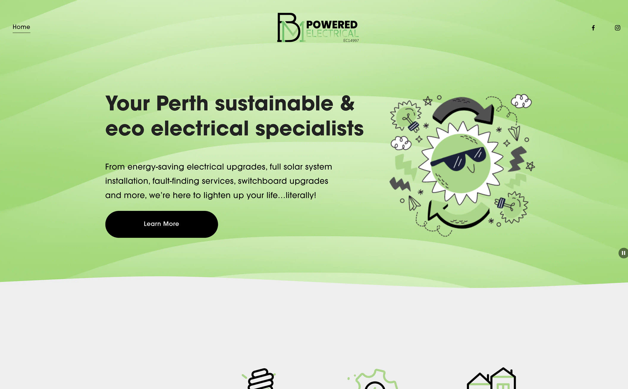 BM Powered Electrical's website showcases a modern and eco-friendly design, with a sleek black and green color scheme that reflects their commitment to sustainable energy solutions. Appealing illustrations and concise content highlight their services in solar installations and energy.
