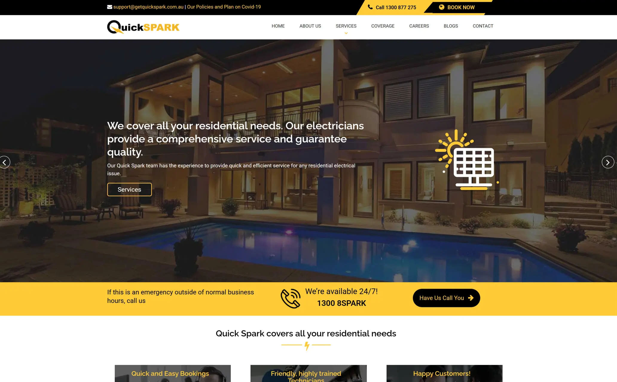 Although some text may feel overwhelming, Quick Spark's website is energetic and modern. The black and yellow color scheme stands out, while the homepage highlights their services with bold icons and an easy-to-find contact number for immediate assistance.