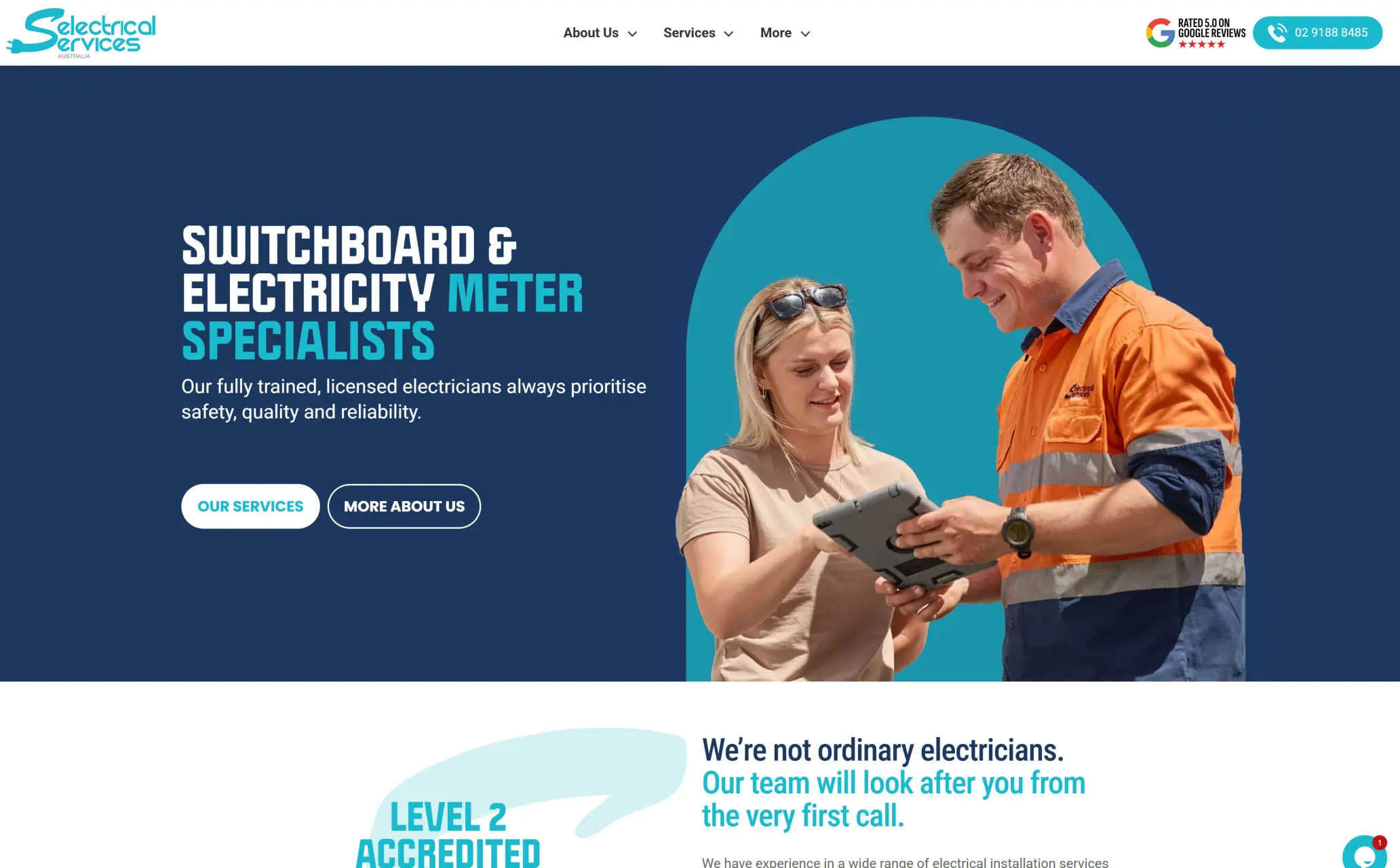 Selectrical Services' website has a modern look, featuring a sleek blue color scheme that feels fresh and trustworthy. The services are clearly listed on the homepage, and a prominent phone number at the top ensures quick contact.