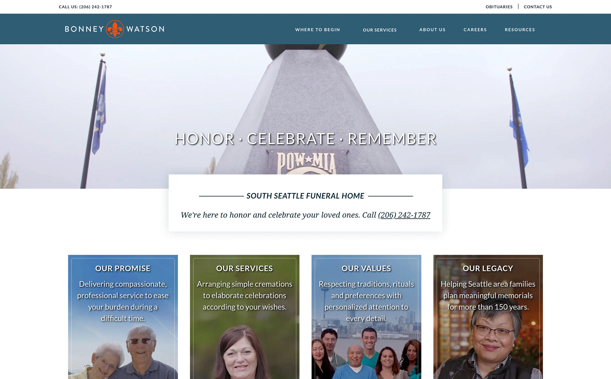 Bonney Watson, a funeral home serving the Greater Seattle area, has been in business for over 150 years and offers a comprehensive range of services. With a tasteful video reel and the keywords "honor," "celebrate," and "remember," the site's home page instantly makes a professional, respectful impression.