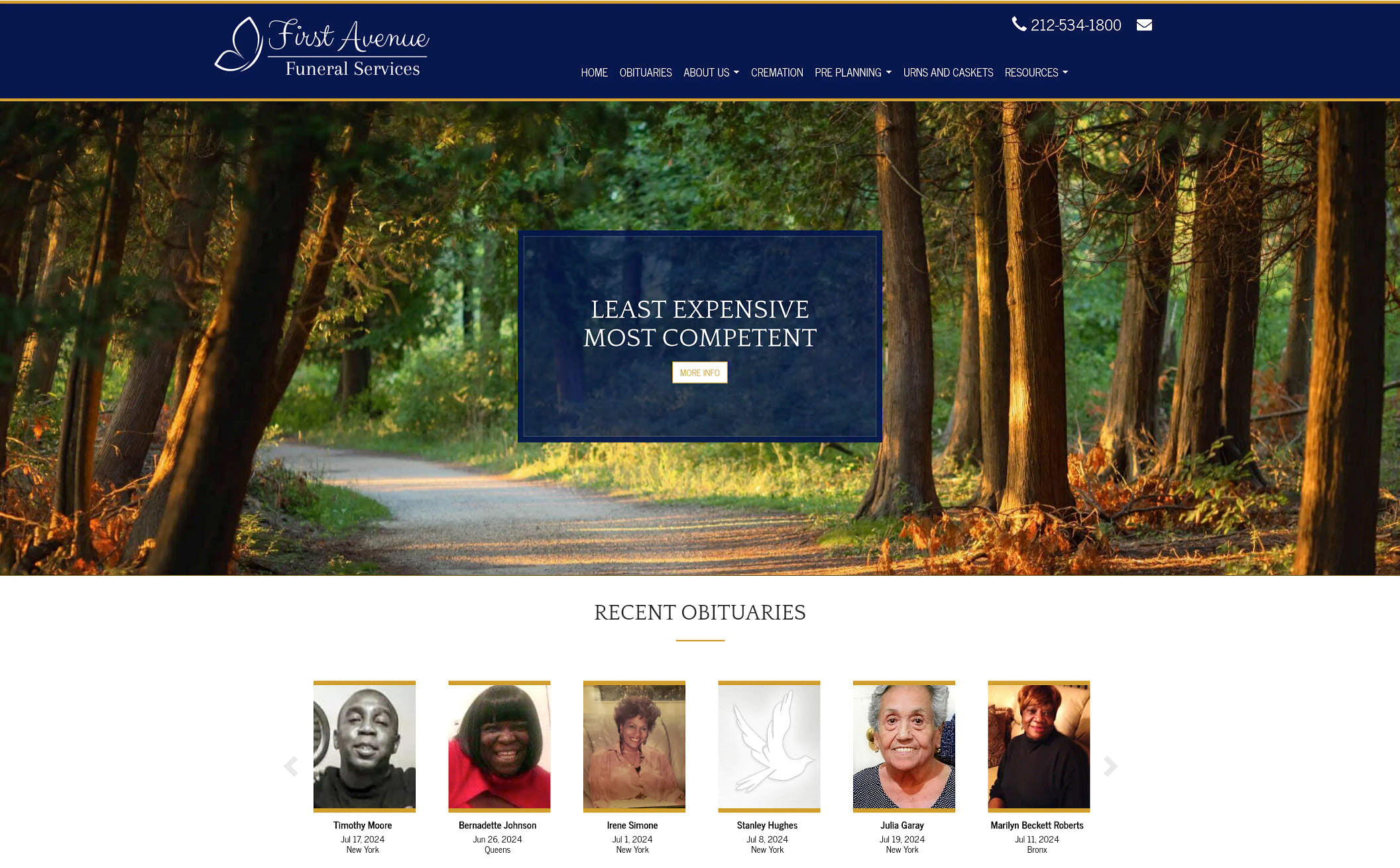 First Avenue Funeral Services offers a wide range of funeral services and describes its offerings as "least expensive, most competent." I liked the website's elegant color palette, which I thought was applied beautifully across the site's pages with subtle design elements.