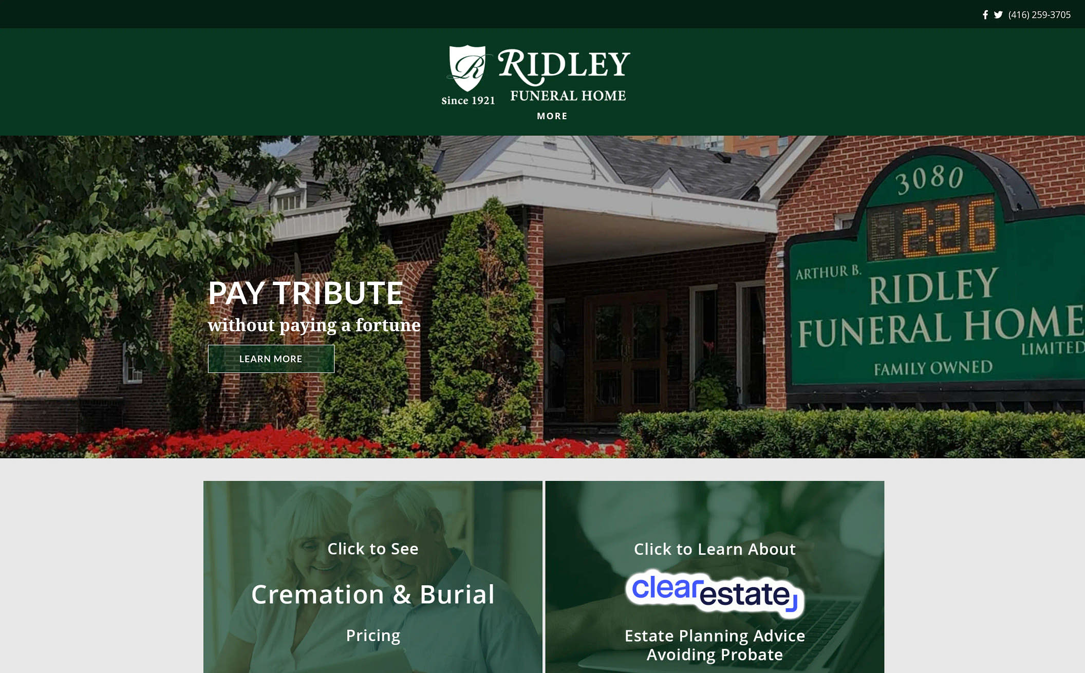 Ridley Funeral Home is a long-established family-owned business that offers a comprehensive range of funeral service options. I found it easy to get a quick overview of what they offer simply by viewing their main menu items' drop-down options and really liked the extensive selection of resources provided.