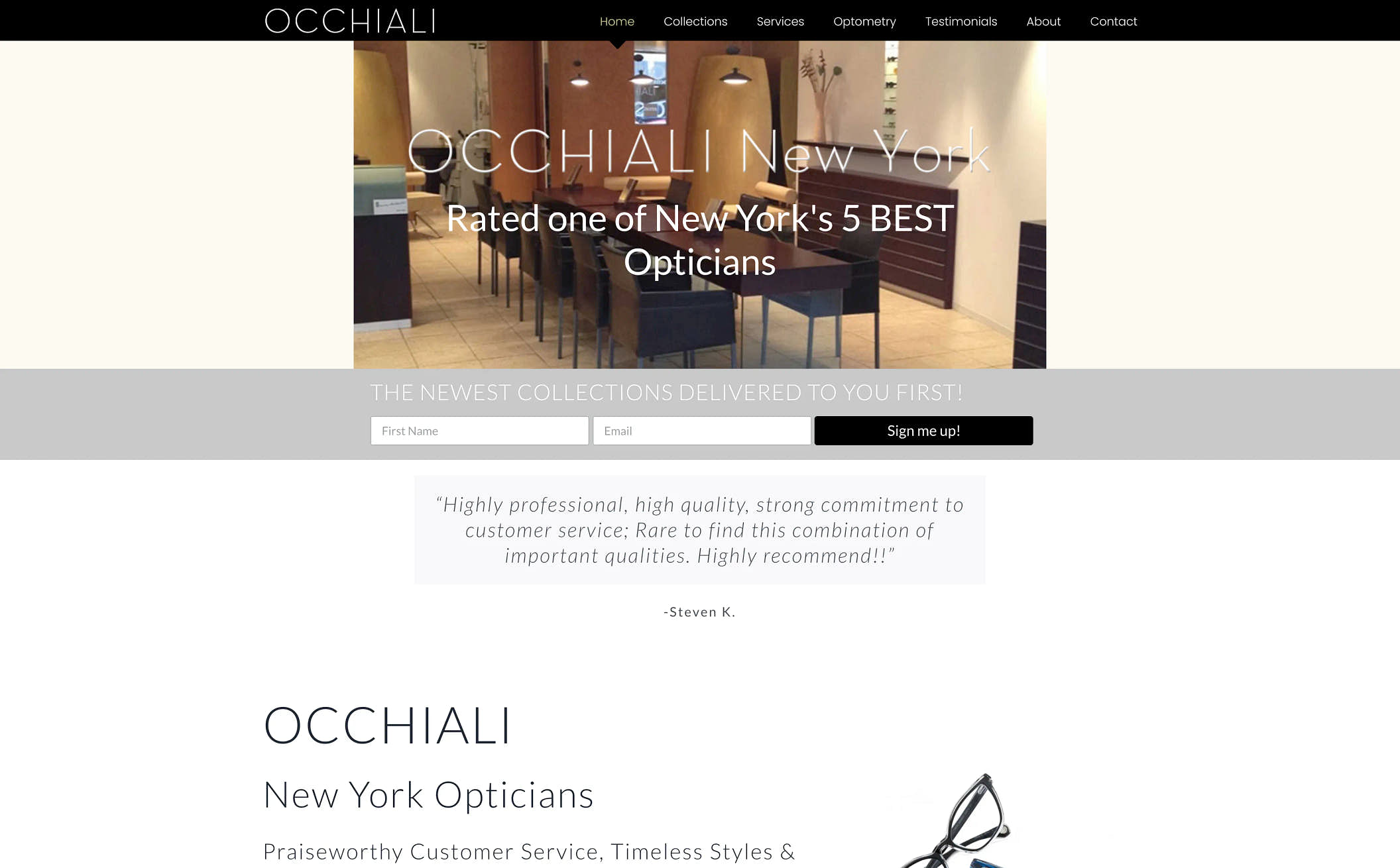 Occhiali New York is an optician on the Upper East Side of New York City that offers high-quality eyewear and has an in-store lab where eyewear is fabricated using the latest technologies in lens design. Their website reflects their premium brand with a stylish, minimalist aesthetic and concise text-based content that effectively imparts their vision, mission, and services.