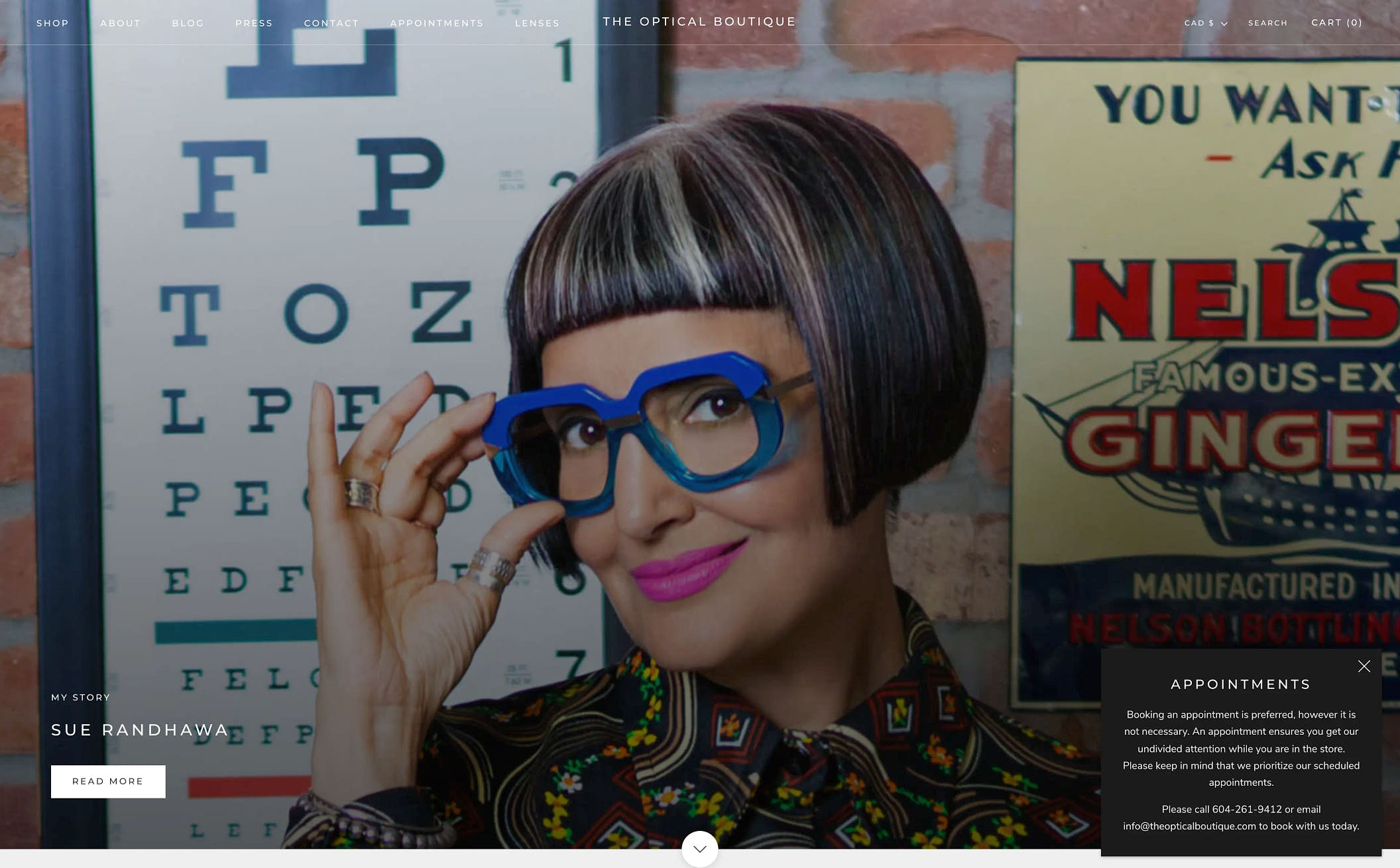 The Optical Boutique is a Vancouver-based eyewear retailer that employs experienced opticians to help customers with eyewear decisions. Their website features team profiles for a more personal touch, and while there is a press section, featured articles are focused more on the store owner than the store.