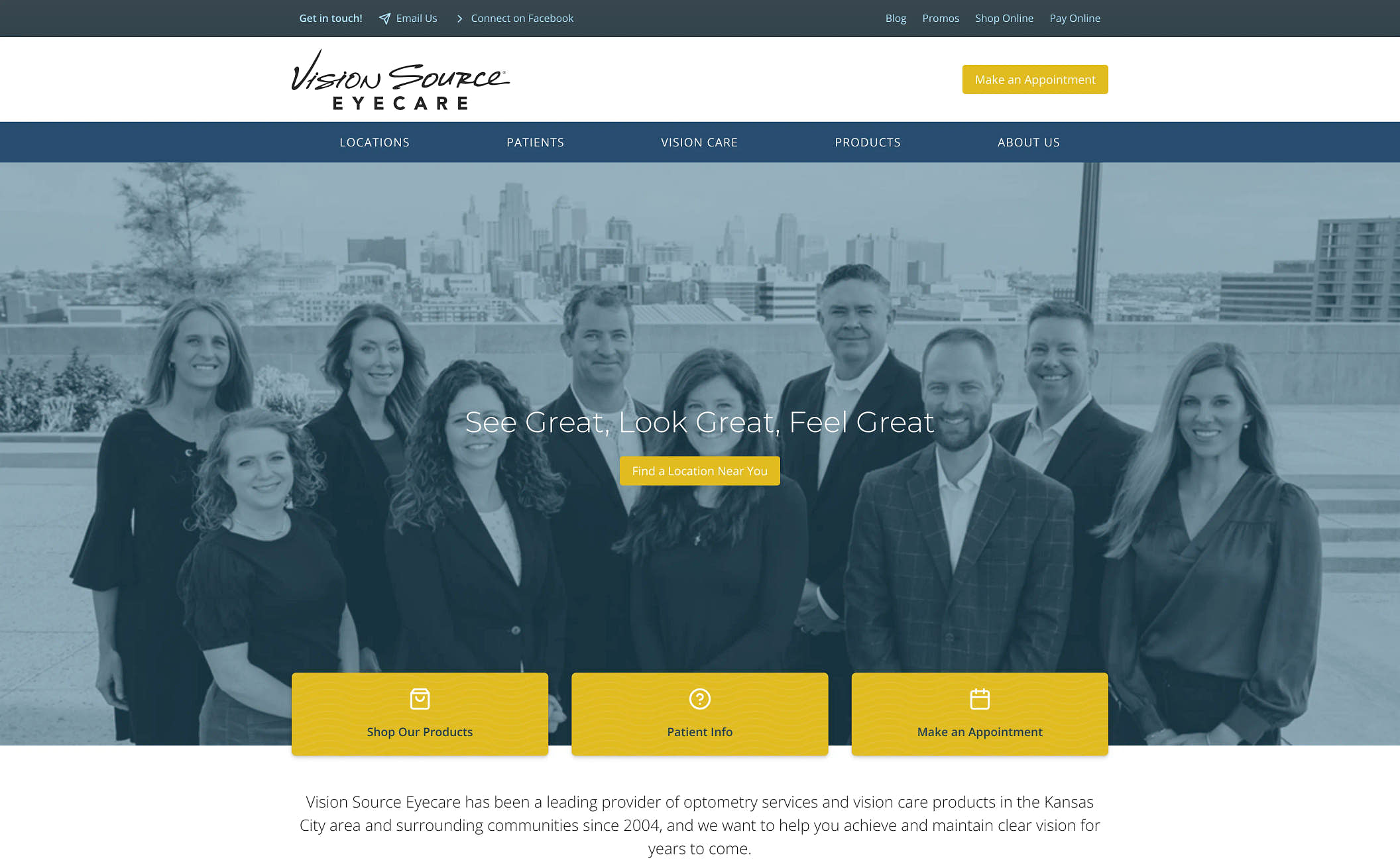 Their website has a modern design with a professional appeal, featuring comprehensive information about the company's services. Visitors can access patient forms and insurance information online, as well as pay their bills. The site also has an online shop for eyewear products with a convenient indication of whether and at which store items are in stock.