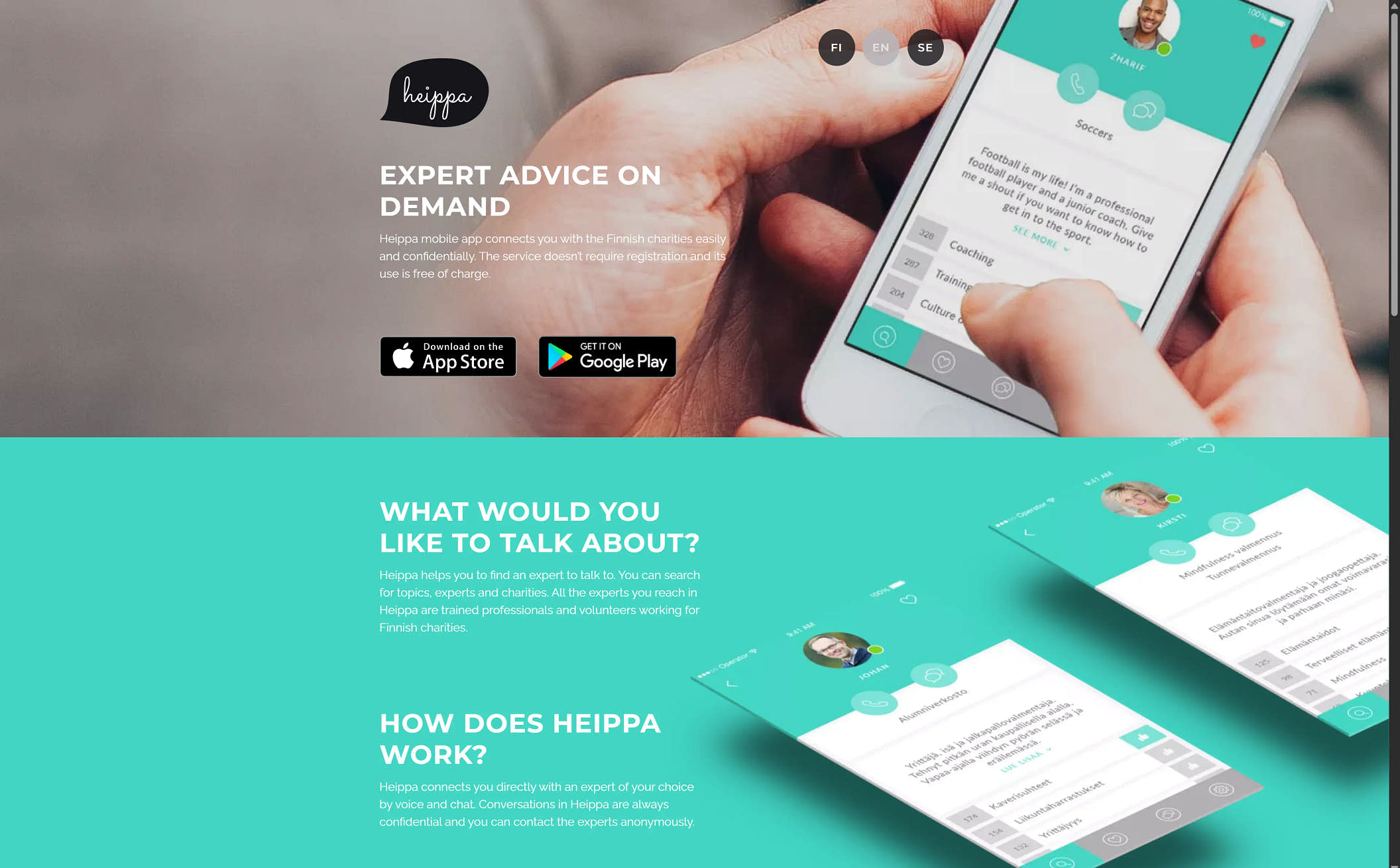 Heippa’s website feels like a safe space, with calming colors and simple design. It connects people with experts for confidential advice, all without needing to sign up. The straightforward layout makes it easy to find help quickly.