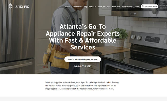 The Apex Fix website template combines crisp whites with gray accents to highlight your services without overwhelming visitors. It’s perfect for appliance repair businesses that want to look sharp and approachable at the same time. You can use the high-res photo gallery to show your repair work in action, and lead visitors naturally from service info to a booking button.