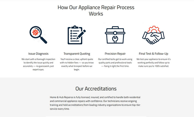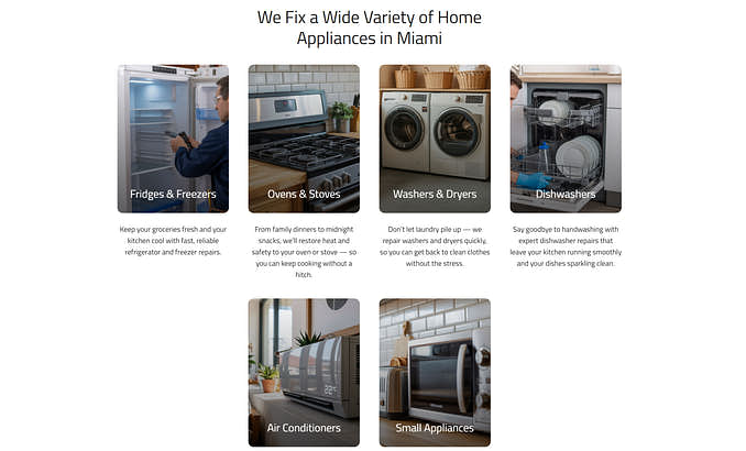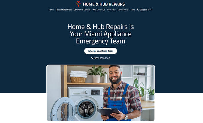 Want your website to feel as dependable as your appliance repairs? This design uses dark navy tones and strong typography to create a sense of urgency and trust. Testimonials, photos, and contact forms are all positioned to guide visitors toward booking — fast.