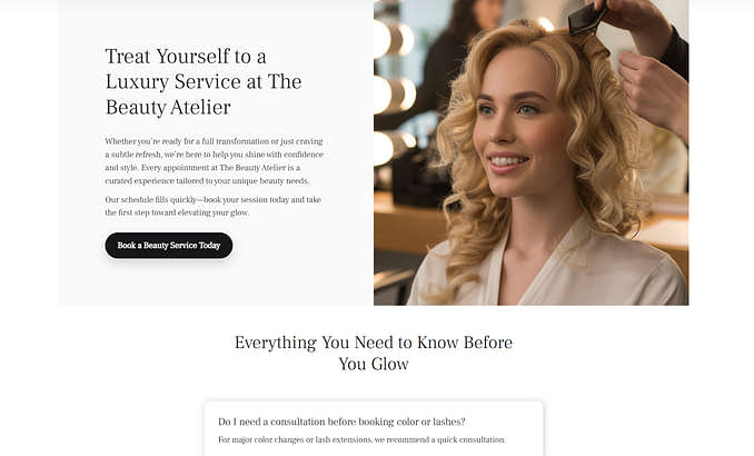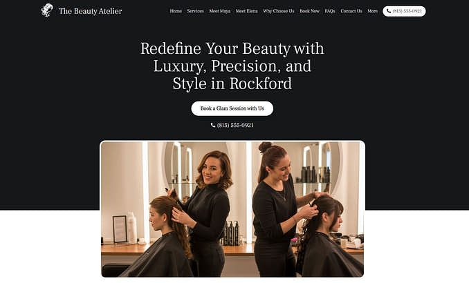 Want your website to feel as polished as your beauty services? This sophisticated black-and-cream design brings elegance to the screen, with bold headlines, full-width imagery, and modern serif fonts that help build immediate trust. Multiple service pages let you spotlight everything from facials to lash lifts.