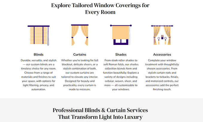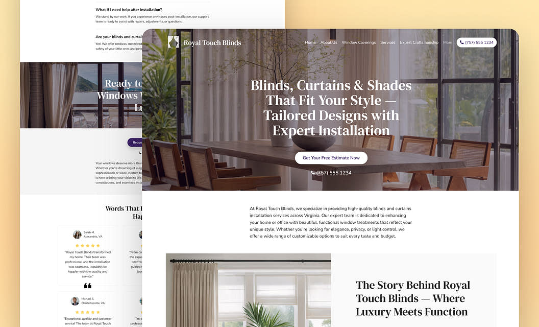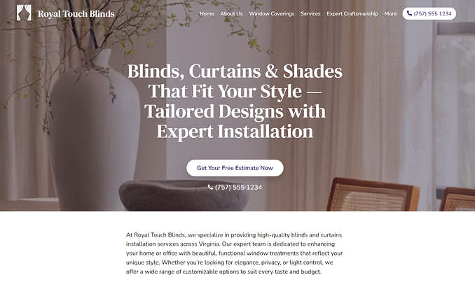 Sleek and grounded, this website design is perfect for blinds and curtain professionals who want their work to speak for itself. The color palette is soft and neutral, the font is crisp, and the full-width images give a high-end feel without looking showy. With multiple service sections, clear calls-to-action, and a mobile-friendly layout, it’s built for clarity and confidence.