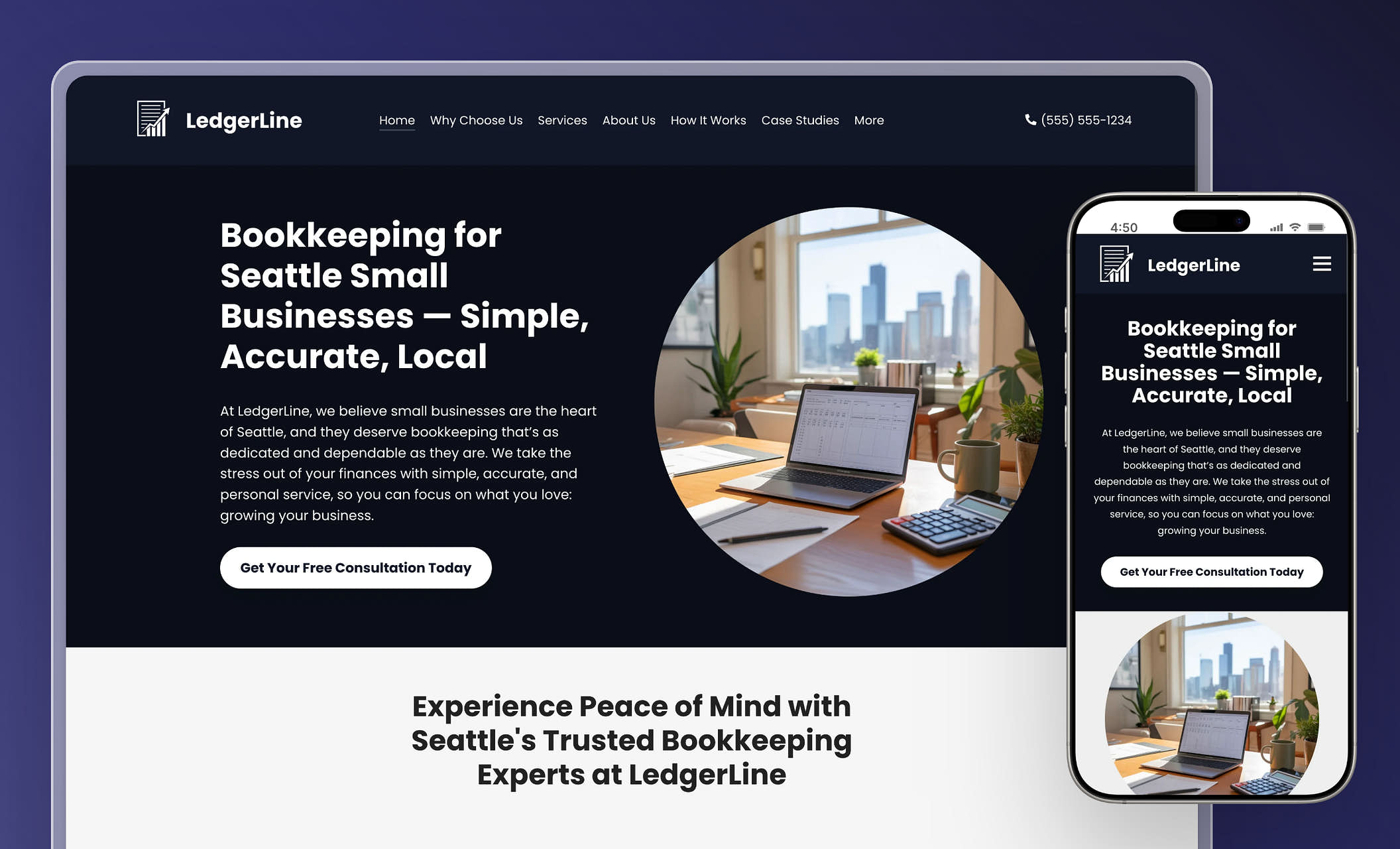 This bold, modern layout builds trust with clear, confident messaging and a streamlined contact button that stays front and center. It's optimized for both desktop and mobile, making it easy for small business owners to reach out with just a few taps.