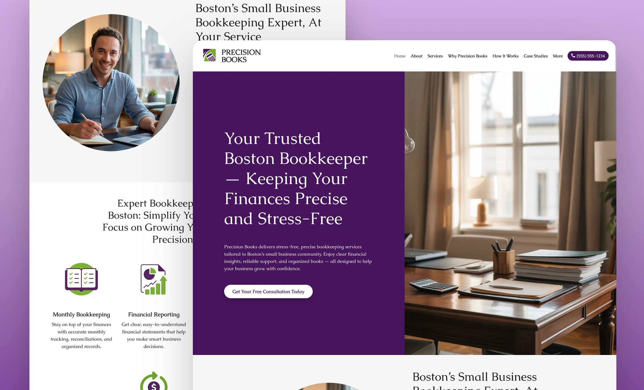Set a new standard for financial professionals with clear service descriptions and real client reviews. This layout walks potential clients through your essential accounting support options, making it easy to understand how you can help their business.