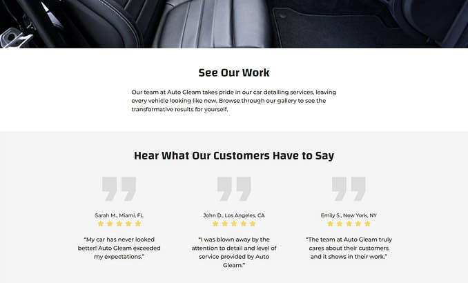 Designed to impress on any device, this responsive layout ensures a great online experience for every visitor. Real client testimonials reinforce your expertise, helping car owners see the value of professional detailing and what their vehicle’s finish can truly become.