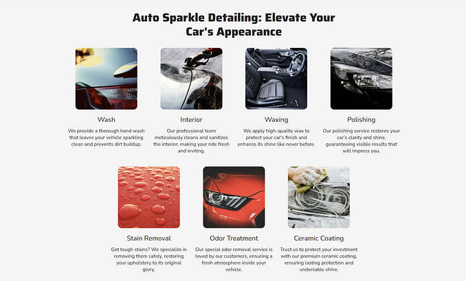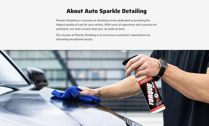 As visitors explore your services, they'll see examples of expert detailing work that showcase the quality they can expect. The prominent call-to-action button makes it simple for potential customers to get in touch when they're ready — no hunting through menus or jumping between pages.