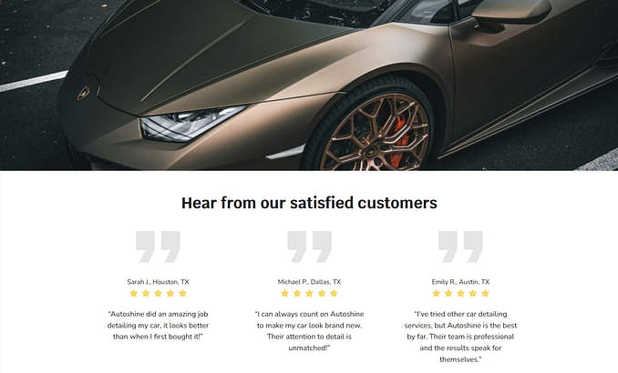 Of course it already comes with professional photos of detailing work to illustrate your services, but you can easily swap in pictures of your own projects too. And even though your work speaks for itself, client testimonial sections are added by default, creating a powerful feedback loop that builds instant trust with customers.