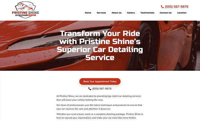 Red accents and measured spacing guide visitors naturally through your services while giving your work room to shine, and the clean layout showcases your detailed vehicles at their best, helping customers see the quality they will get.