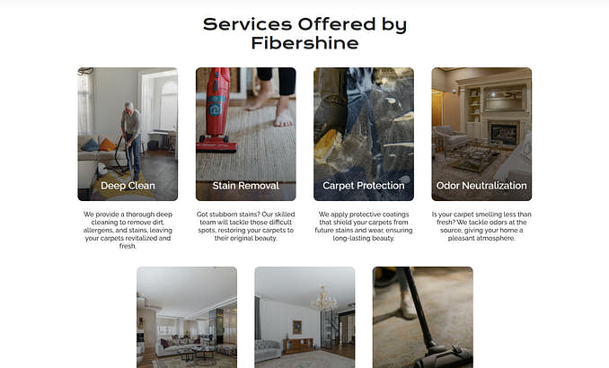 Fibershine positions your carpet cleaning business as the go-to choice for commercial clients. It features a dedicated section for commercial services, professional photos throughout, and a clean design.