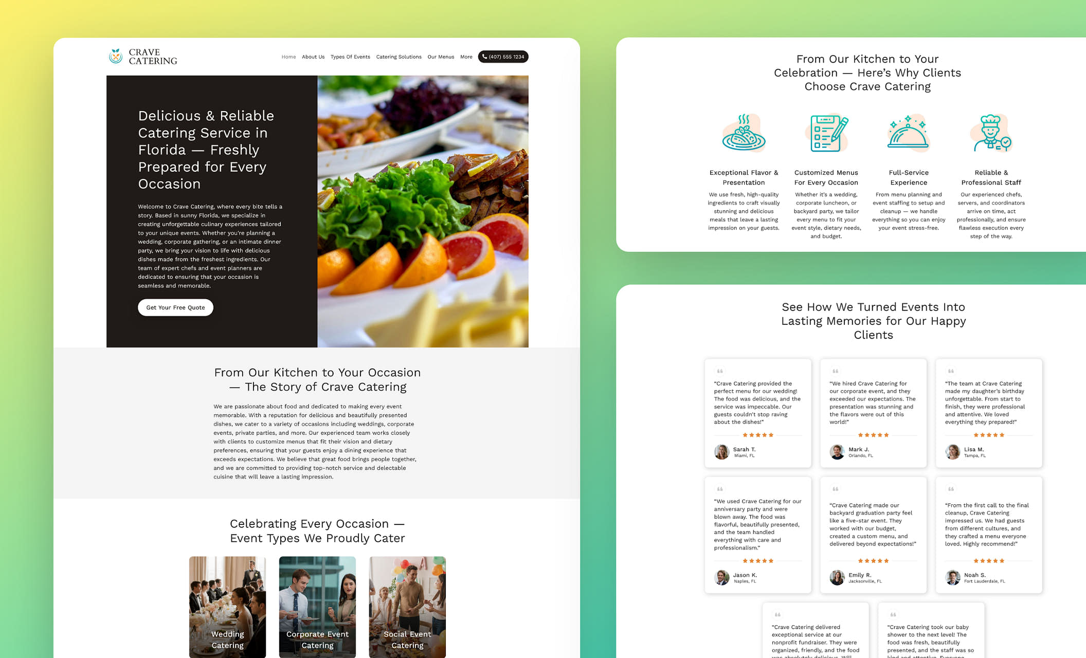 This modern layout works like a conversation: it shares your story, shows your services, and builds credibility with real reviews — all before visitors ever scroll. Great for caterers who want more event inquiries with less back-and-forth.