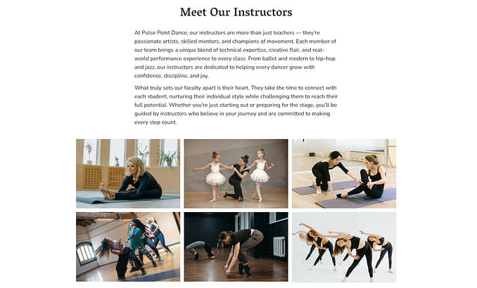 This sleek, modern design blends structure and soul to help your dance studio grow online. Soft gradients meet clean typography, and a storytelling layout guides visitors from discovery to sign-up. It’s perfect for studios that want to build trust with strong visuals and clear messaging. Wanting to make some updates? Add new classes, change instructor bios, or adjust your images anytime with our AI-powered editing tools.