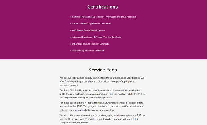 The Sit & Stay Academy template is built to highlight your training and behavioral expertise in a way that feels easy, organized, and human. Deep purples paired with clean white sections create contrast without clutter, guiding the eye through certifications, services, and testimonials. Designed with mobile users in mind, the layout adjusts beautifully across all devices.