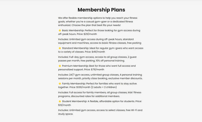 If you run multiple programs or want to feature different coaches, this setup keeps it organized and easy to scan. You can highlight personal training, group classes, or gym access without overwhelming visitors — and the clean structure makes sure every section stands out.