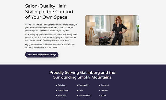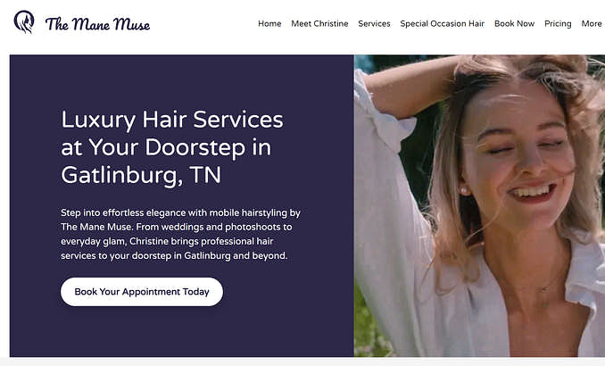This is the ideal website template for mobile stylists who want to tell their story and build instant trust. With space for a personal intro, a glowing wall of testimonials, and a booking button that never gets lost, The Mane Muse template is designed to guide visitors step-by-step from discovery to action. Large images showcase your work, and the layout adapts seamlessly across screens—whether clients are browsing on their phone or planning a wedding from their desktop.