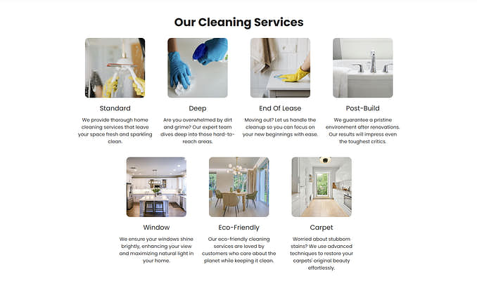 This clean and engaging design also features photos of sparkling homes to set the right expectations. Want to highlight your own work? Swap in your best images to show off sparkling kitchens, tidy living rooms, and perfectly made beds.