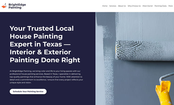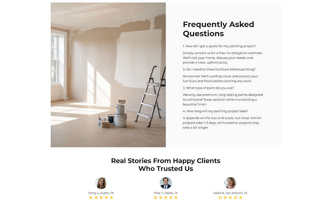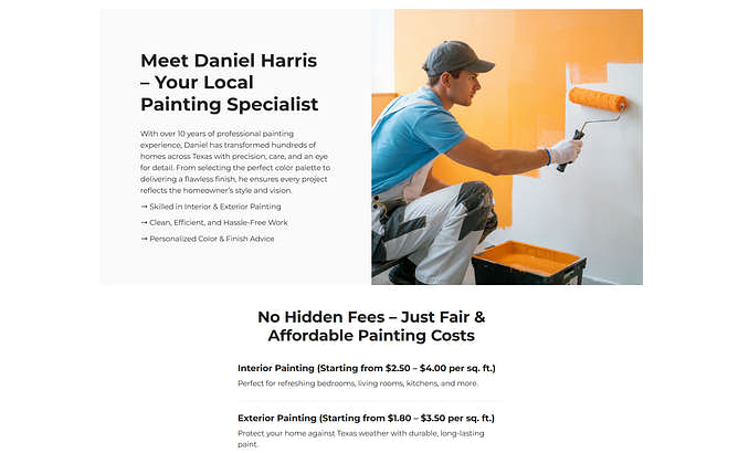Whether you're promoting interior makeovers, accent wall work, or exterior updates, the layout keeps everything organized and easy to browse. You can highlight client benefits like hassle-free work, finish consultations, and fast service areas—all while updating your site in real time with Zarla's AI editing tools. It’s SEO-friendly, mobile-ready, and designed to turn casual browsers into booked clients.