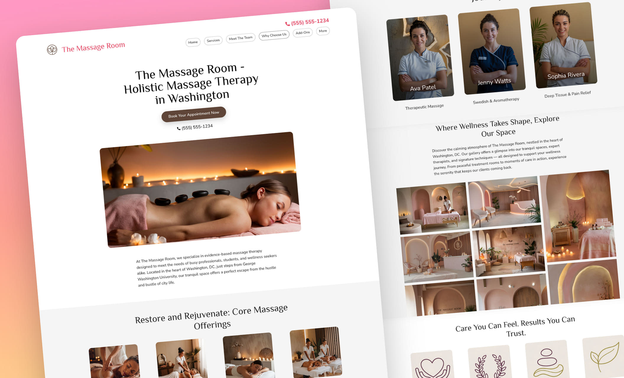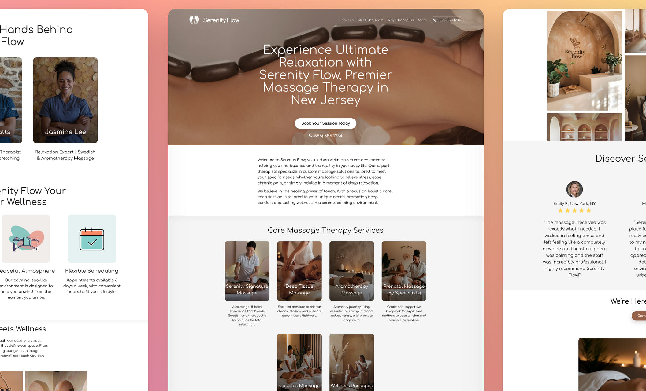 Let visitors feel the calm before they even walk in. This beautiful layout brings your massage studio’s warm, tranquil energy online — complete with soft visuals, instant contact options, and personnel profiles that build trust in your team.
