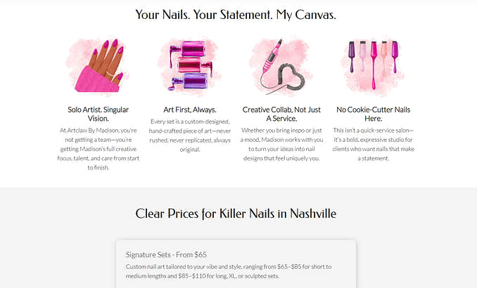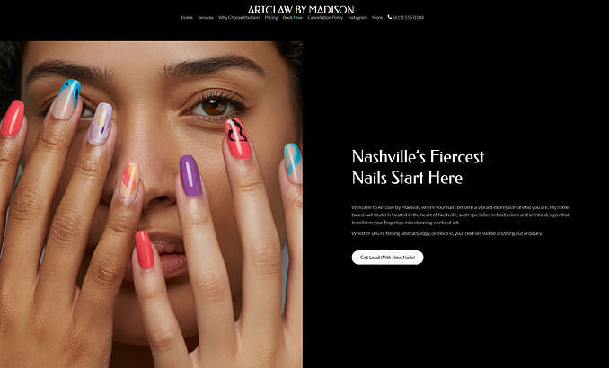 Multiple service sections give you space to break down your offerings, and the design keeps the focus on your talent. Want to show off new work or switch up the vibe? The AI-powered drag-and-drop tools make updates a breeze. From SEO features to schedule app integration, this site does the heavy lifting so you can focus on your nail art.