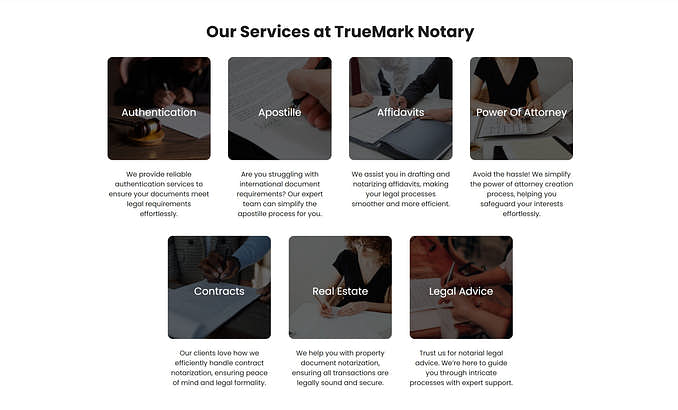 This is a template that turns visitors into clients by answering their questions upfront. The home page starts with clear service descriptions, showcasing your offerings at a glance. Photos of notary sessions show exactly what to expect upon arrival.