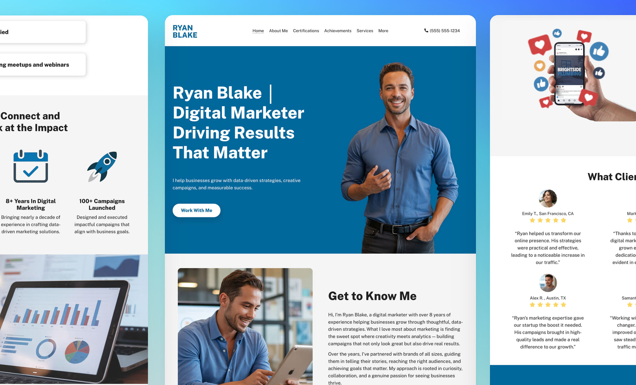 Build trust in seconds with a site that feels as professional as your campaigns. This template is ideal for marketers ready to convert visits into consults. Plus, easy navigation and a clear value proposition make it effortless for businesses to reach out to you.