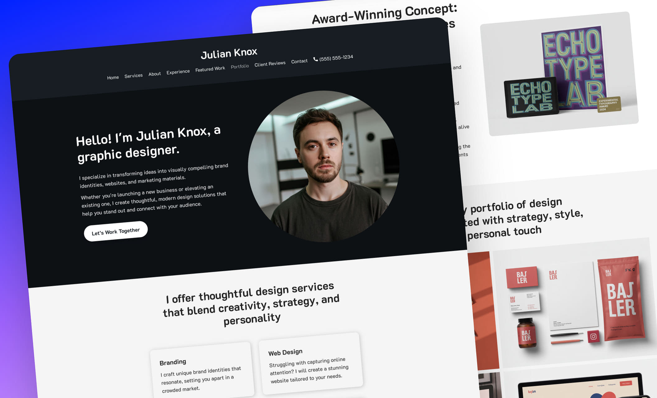 Let your design style shine before you say a word. This sleek, portfolio-first layout puts your visuals in the spotlight while giving space for storytelling. It’s perfect for designers who want to blend creativity with clarity—and make sure visitors remember their name.