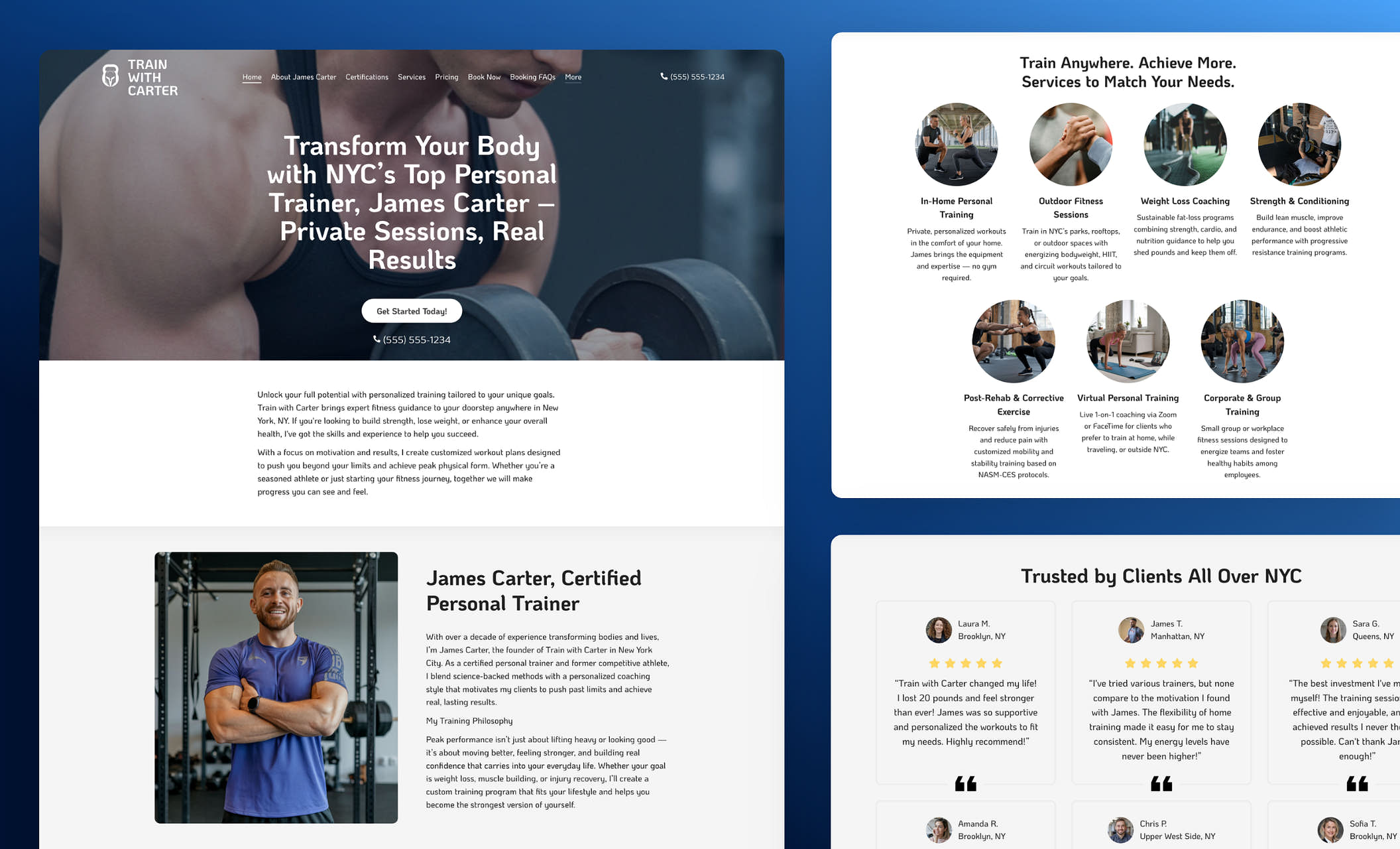 Transform your online brand with a sharp website layout and striking progress photos that make it easier for clients to picture their own results. And with various contact options built in, they won’t hesitate to reach out — even from their phone between sets.