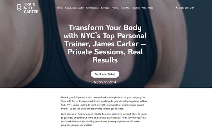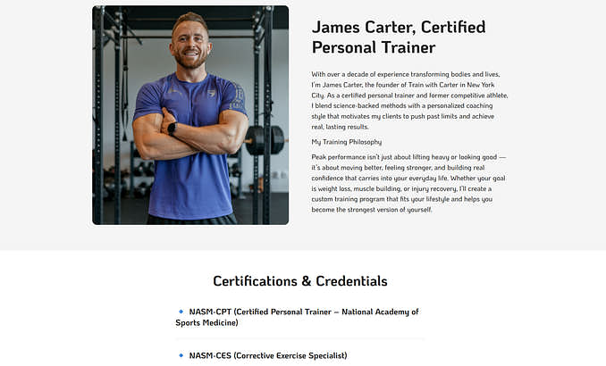 This deep navy and crisp white website layout feels polished but grounded — perfect for trainers who want to show both grit and professionalism. Clear service sections help guide potential clients to the right program, while testimonials and sharp portrait photography add credibility.