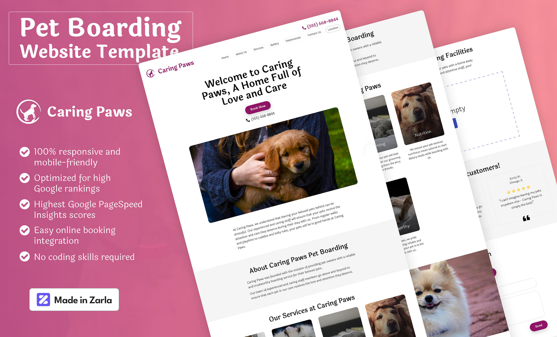 Reach pet owners with a site that shows your warmth and capability. Your testimonials will build trust, while fast-loading pages help put your website at the top of the search results.