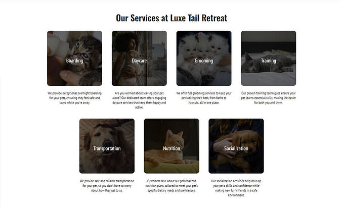 Got more services to offer? As a luxury pet retreat, you may want to highlight your expert grooming services and other packages besides pet boarding. Zarla's intuitive editing tools let you add new services instantly, and pair each service with a photo and description, so your visitors can understand exactly what makes your business special.