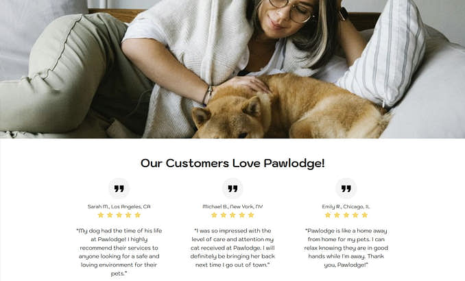 "This site does all the reassuring for you. Pet parents see the play areas, cozy napping spots, lots of happy pets, and they’re instantly at ease."