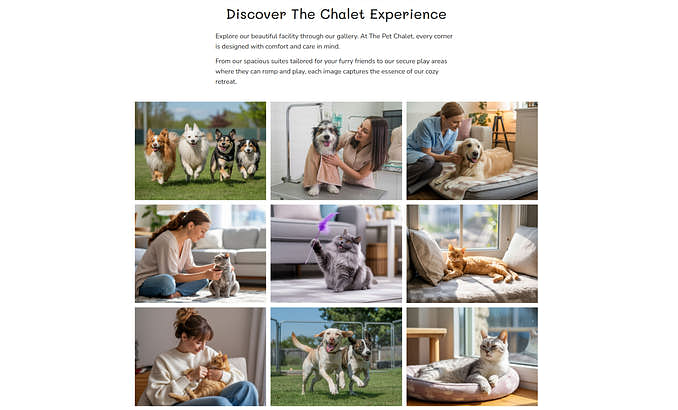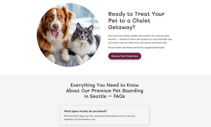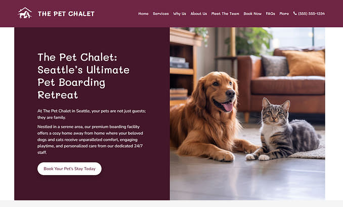 This pet boarding website template combines confident headlines with cozy design choices to help you stand out as a premium provider. The bold burgundy background and clean layout create a calm, upscale feel, while the full-width pet photo instantly makes visitors feel at ease.