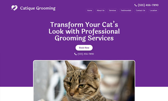 This elegant template helps you build a professional online presence — without the tech hassles. Pet owners who want a spa-like experience for their cats will be drawn in with captivating visuals, sophisticated typography, and a layout that exudes luxury. Clear, compelling content instantly communicates the expertise and high level of care your salon provides.