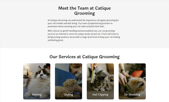 Optional social media integrations keep your audience engaged, allowing you to grow your community with ease. Meanwhile, search-optimized pages improve your visibility on Google and other search engines, attracting more local clients who need expert cat grooming.