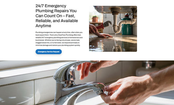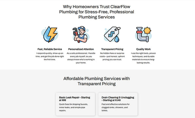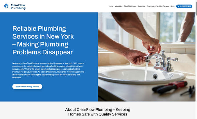 This clean, modern plumbing template is ideal for solo pros who want to project confidence and clarity. The structured layout makes your offerings easy to understand, while the bold blue color palette adds a layer of trust that’s perfect for first-time visitors. Clear service pricing, visual service highlights, and multiple call-to-action buttons keep things moving — guiding visitors toward booking without any second-guessing.