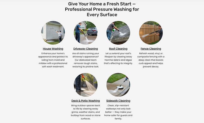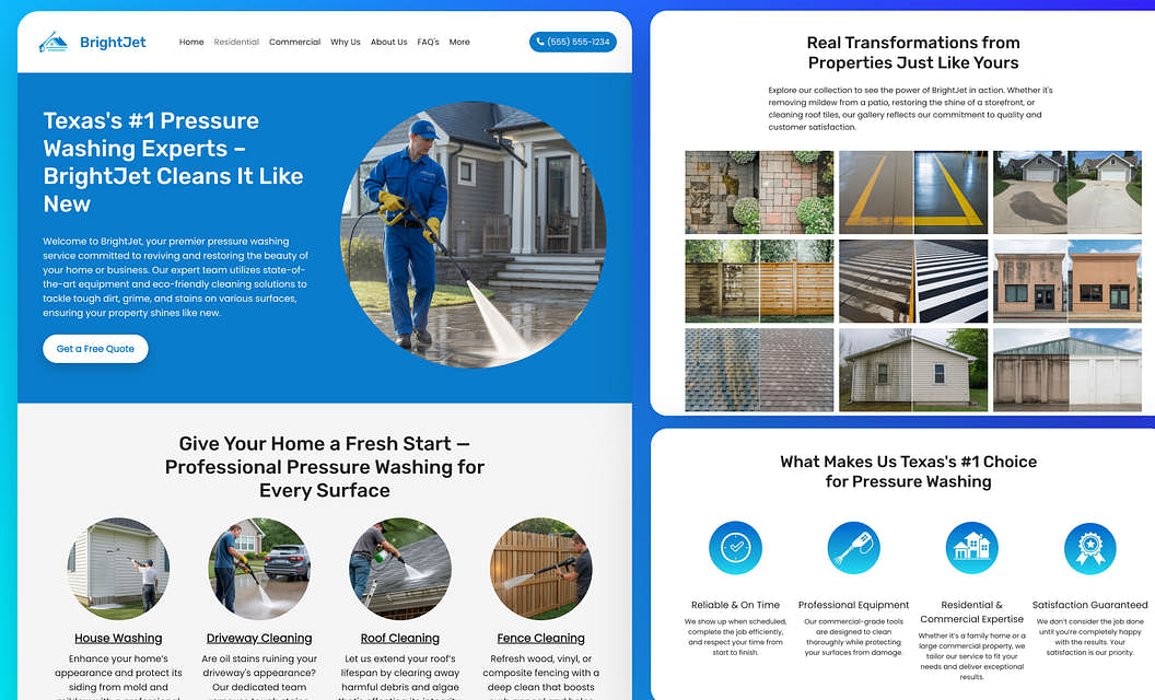 Your work speaks for itself, and this template gives it the room to do that. Whether you’re cleaning gas stations or backyard patios, each service can have its own space — with photos, details, and a contact form that’s always within reach.