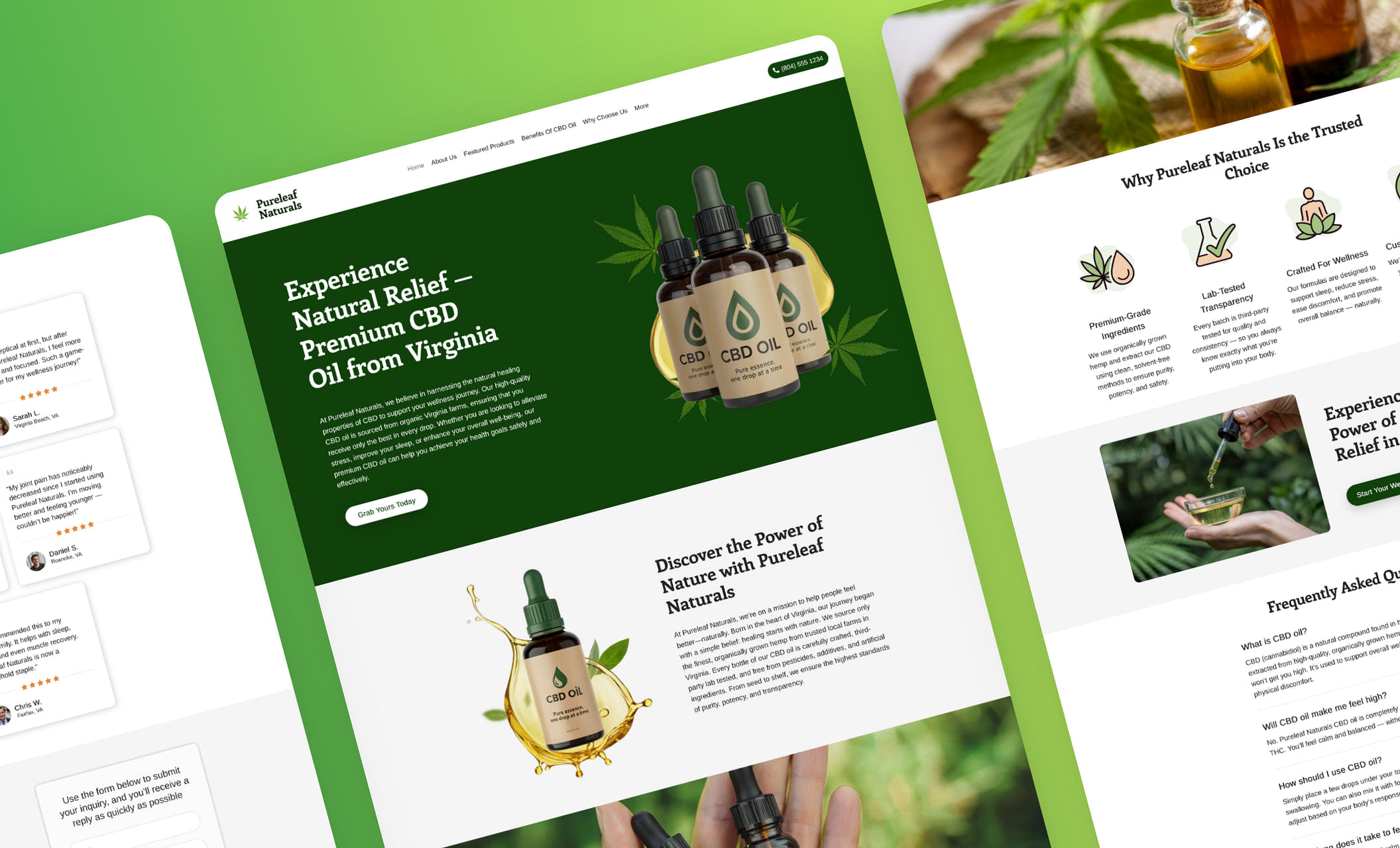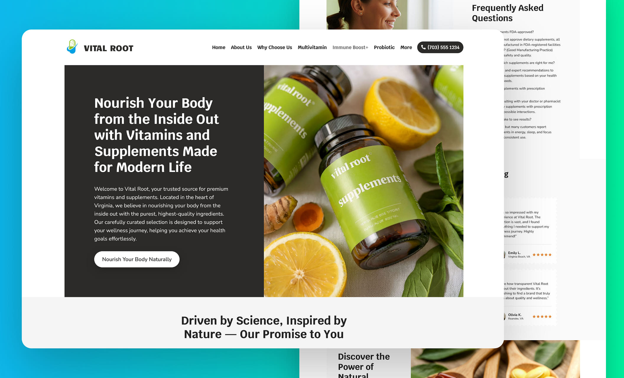 Balance scientific credibility with wellness in a clean, mobile-ready format. Throughout the design, thoughtful use of photography and testimonials reinforces product quality and consumer trust — all while keeping the focus on wellness-driven conversions.