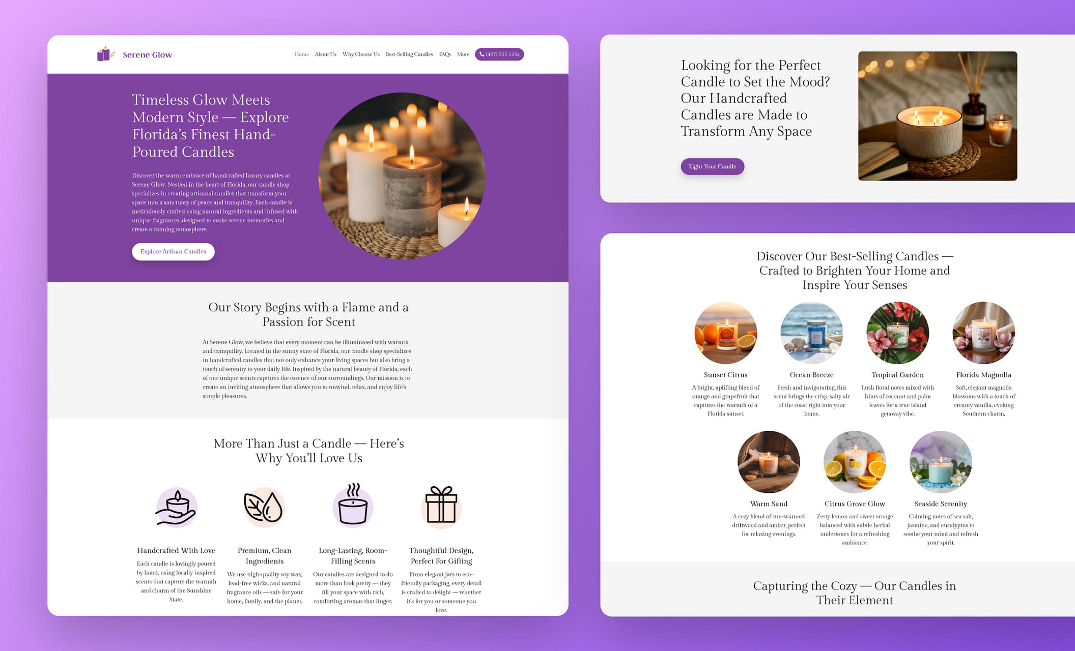 Set the mood and tell your story with a soft, elegant design that radiates warmth. Perfect for handmade goods and boutique lifestyle brands, this template blends storytelling with sensory appeal. Rounded imagery and thoughtful feature sections make it easy to convey your passion.