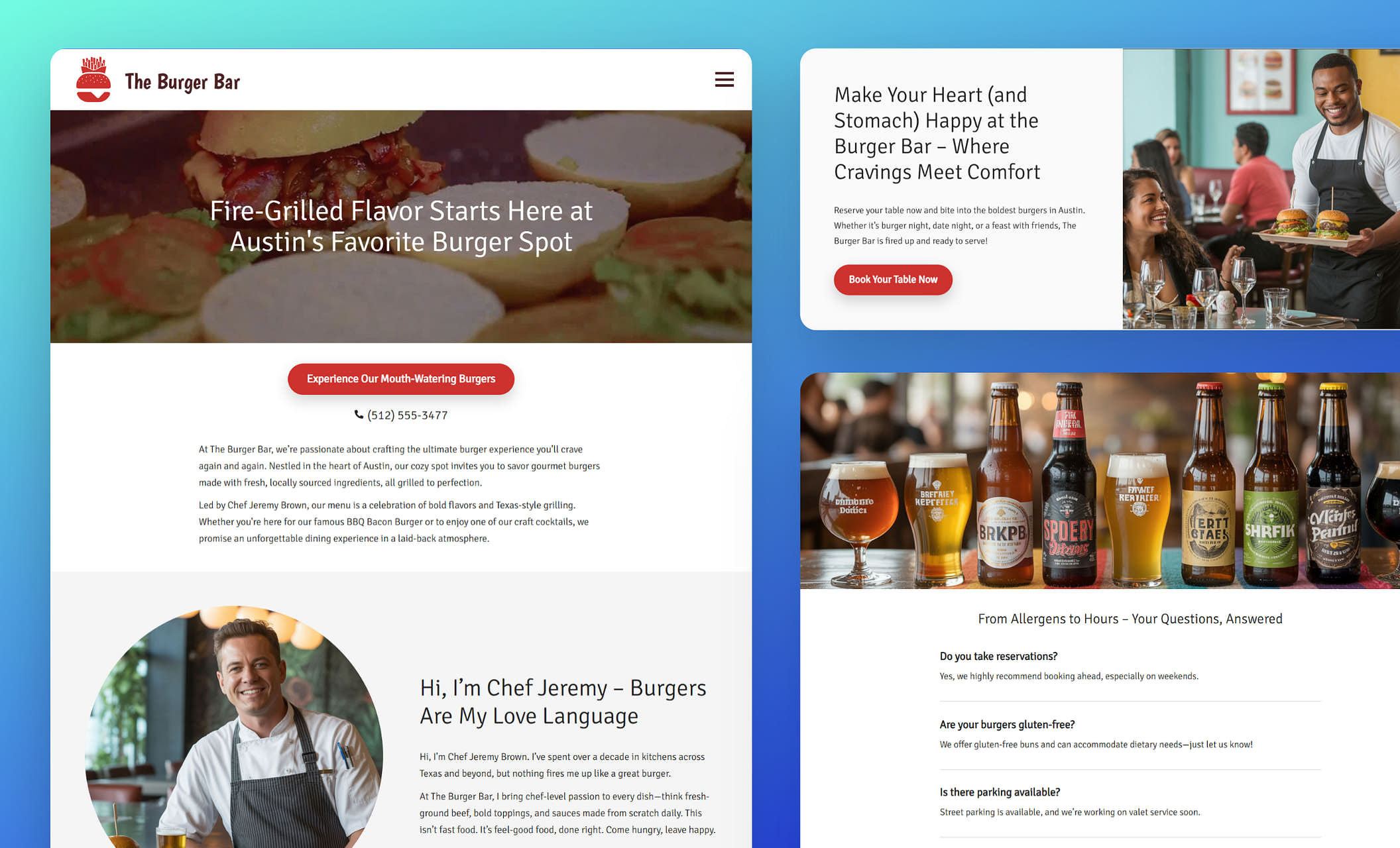 Boost your restaurant’s visibility with a sleek, customizable website that loads fast, features built-in SEO, and looks great on both desktop and mobile.