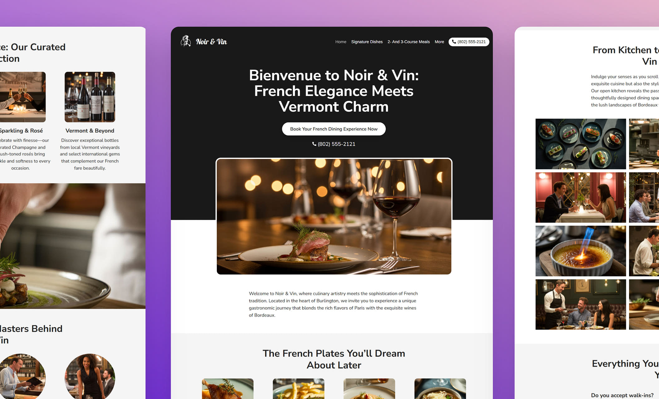Luxury meets intimacy in this high-end design that mirrors your fine dining experience. The dramatic black-and-white palette makes every photo and dish pop, while the elegant layout guides visitors smoothly from intro to booking.