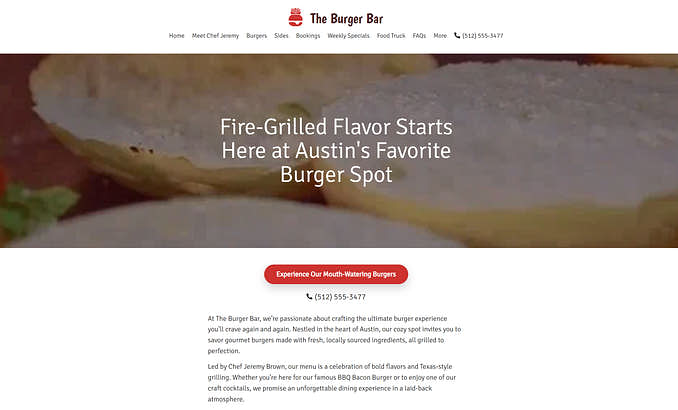 If your restaurant thrives on bold flavors and laid-back charm, this vibrant website template is made for you. With playful fonts, colorful accents, and a focus on big, juicy visuals, it creates a fun, inviting first impression. A sticky booking button and front-and-center phone number help guests reach you fast — no digging around required.