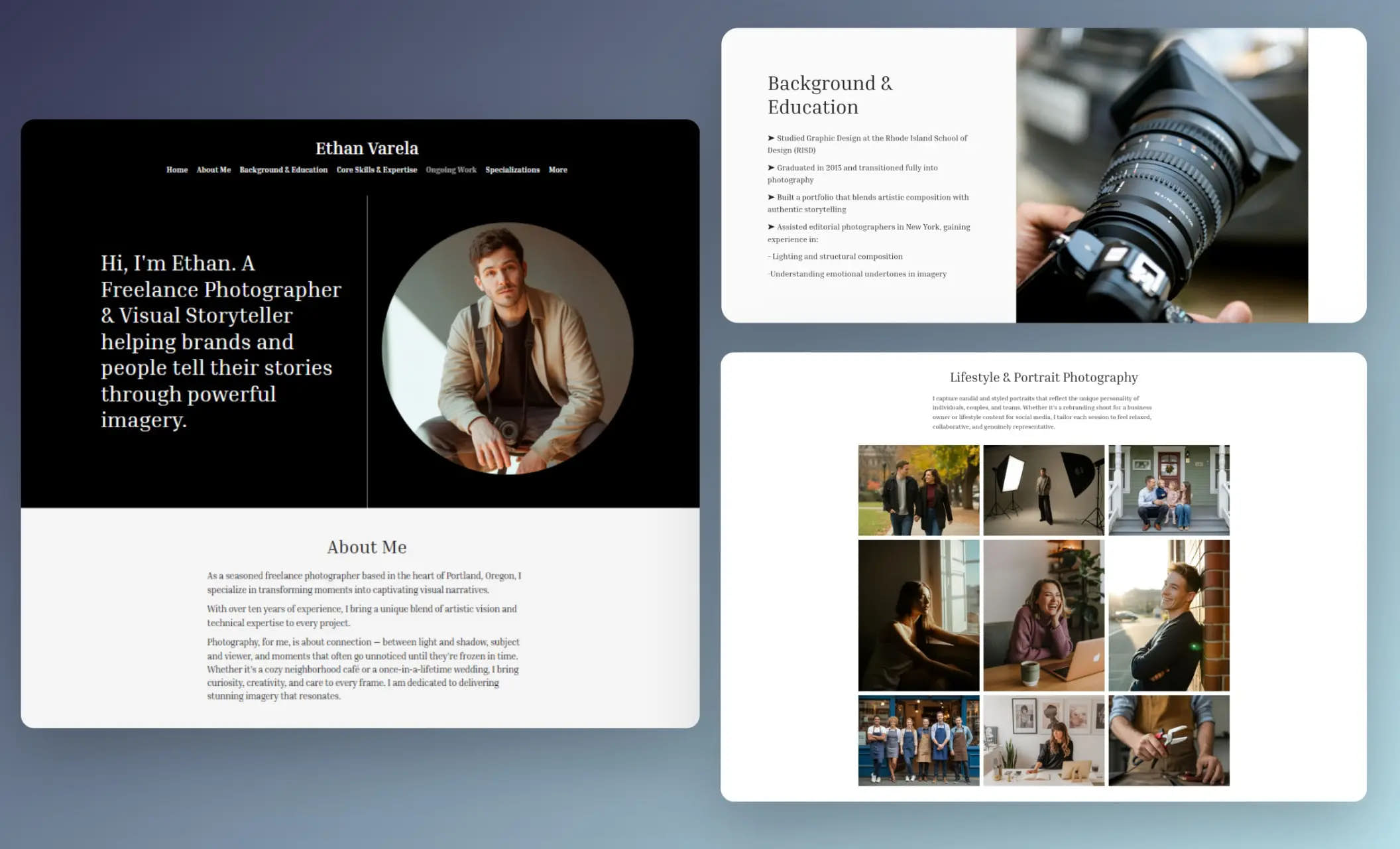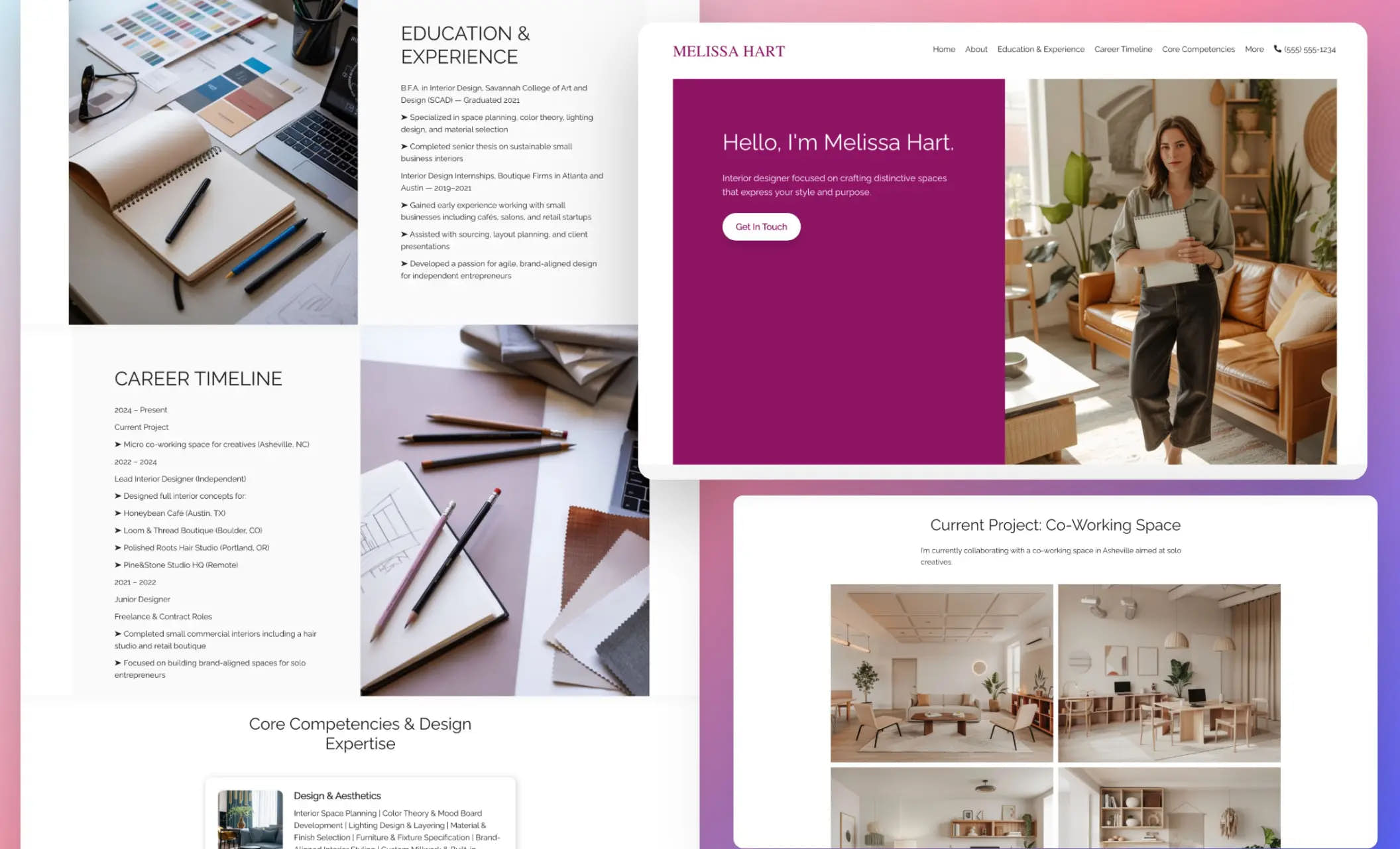 This full-width resume website template feels like a story. Image galleries and clear service sections help visitors get to know you — and remember what you offer.