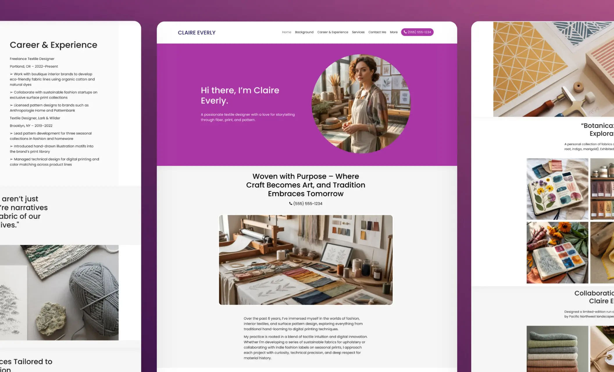 The clean purple layout and soft visuals keep the focus on your work. Your interior design experience leads the page, with contact tools always close at hand.